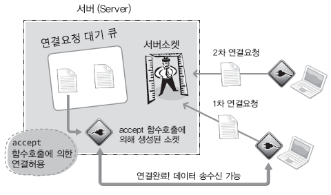 accept로 어떤 클라이언트의 connect를 허용하면 새로운 accept에 의해 내부적으로 데이터 입출력에 사용할새로운 소켓이 생긴다.