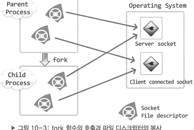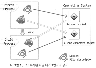 자식 프로세스는 부모 프로세스의 서버 소켓과 클라이언트담당 소켓 두 개의 디스크립터를 갖는다. 마찬가지로 부모 프로세스는 서버 소켓과 클라이언트담당 소켓 두 개의 디스크립터를 갖는다.