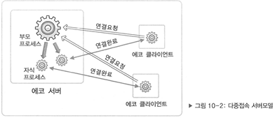 위 그림은 멀티프로세스를 사용해서 다중 접속을 허용하는 서버를 그림으로 나타낸 것이다.
