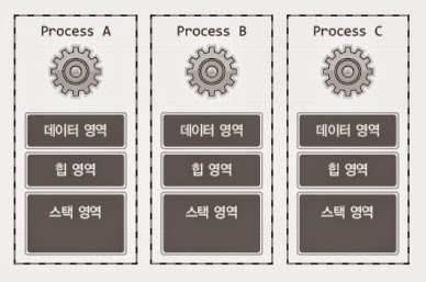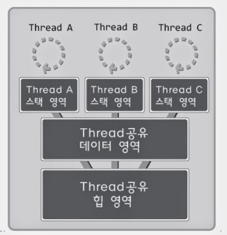 하나의 프로세스 내에서 여러 쓰레드가 각각 스택영역만 갖고 힙과 데이터 영역(전역변수)은 공유한다.