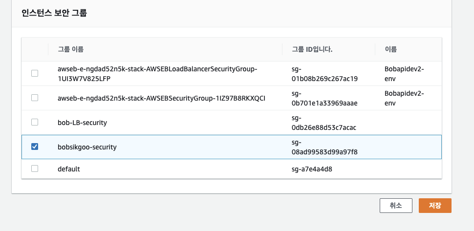 인스턴스 보안 그룹 적절히 지정해서 선택