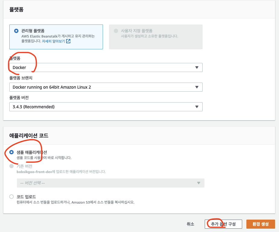 관리형 플랫폼 - docker 선택 후 추가옵션 구성 버튼 클릭