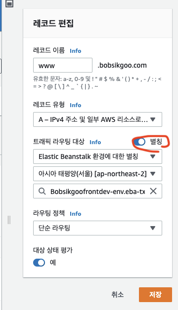 별칭으로 방금 생성한 elastic beanstalk 환경에 연결