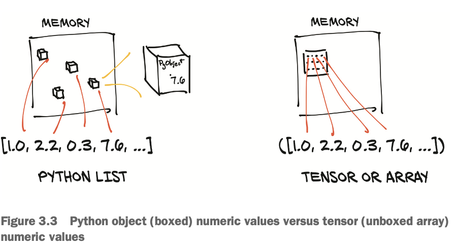 PyTorch tensors나 NumPy는 `unboxedC` 뉴메릭 타입을 갖는 연속된 메모리 블럭을 본다(view). (리스트나 튜플같은 파이썬 오브젝트는 각자 메모리에 할당됨).
