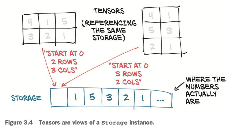 텐서 인스턴스는 Storage 인스턴스의 view이다. offset과 per-dimension strides를 사용하여 storage을 인덱싱할 수 있다.