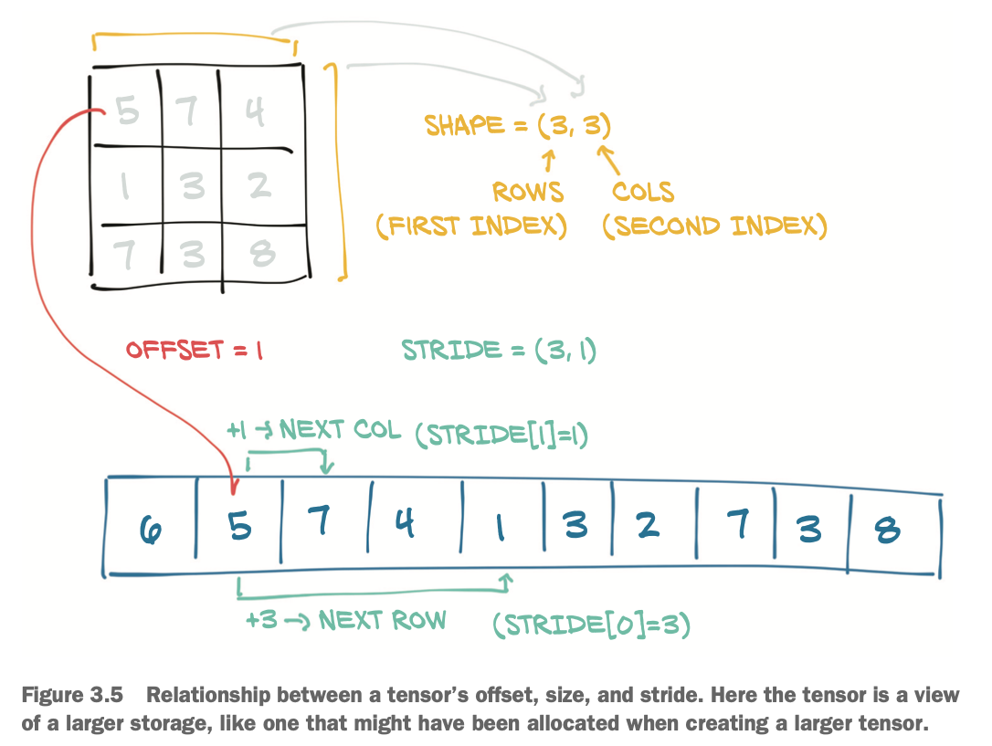 size는 shape과 같은 의미로 각 차원의 크기를 의미한다. offset은 storage에서 해당 텐서의 시작 인덱스를 의미한다. stride는 차원마다 다음 요소를 참조하기 위해 storage에서 건너 뛰어야하는 간격을 의미한다.