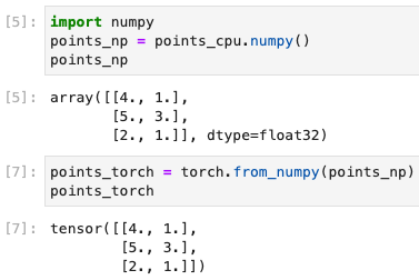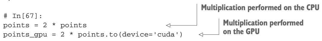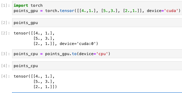 이렇게 device='cuda'를 하면 데이터를 일반적인 RAM이 아닌 GPU의 RAM에 올린다. 'cuda:0' 이런식으로 gpu코어가 여러개일 때 번호를 지정해주는 방식도 사용한다. points.cuda(), points.cuda(0), points_gpu.cpu() 같은 방식으로 변환도 가능하다.