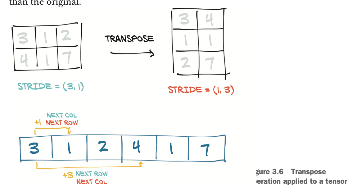 storage의 변경없이 전치행렬을 구할 수 있다. stride의 순서만 바꾸면 된다. 고차원에 대해서도 마찬가지이다.