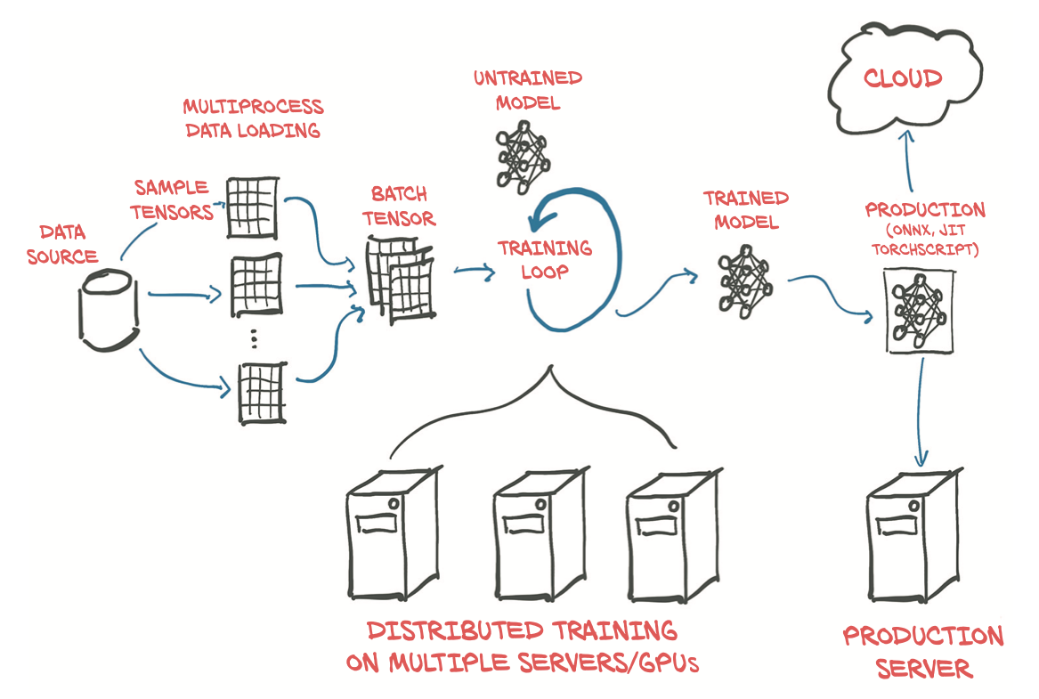 위 그림과 같이 스토리지에서 데이터를 가져올 때 tensor형태로 바꾸고 batch로 묶어주는데, PyTorch는 이걸 Dataset, DataLoader 클래스로 제공함.(ch7)