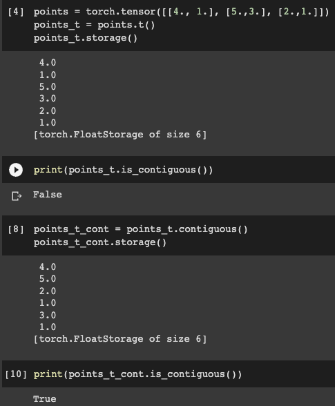 transpose연산을 하면 이 contiguous속성이 파괴된다. 연산의 효율성을 위해서 contiguous함수 등을 통해 메모리 재배치해야하는 경우가 있다. 'is_contiguous()'로 텐서가 contiguous한지 확인할 수 있다.