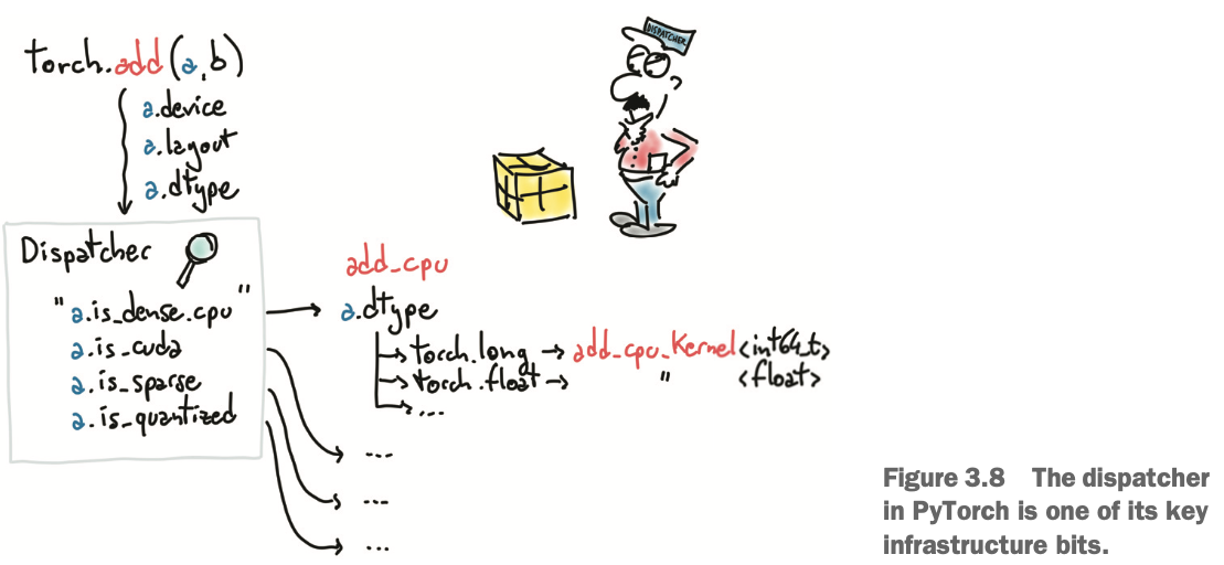sparse tensor, quantized tensor등 다른 변형이 있음. 여태 소개한 일반적인 tensor는 dense tensor 또는 strided tensor라고 함. tensor API의 규격만 만족하면 모두 tensor인 셈. 아래 그림과 같이 텐서 연산 전 디스패처를 거치도록 해서 알맞은 연산을 할 수 있도록 함.