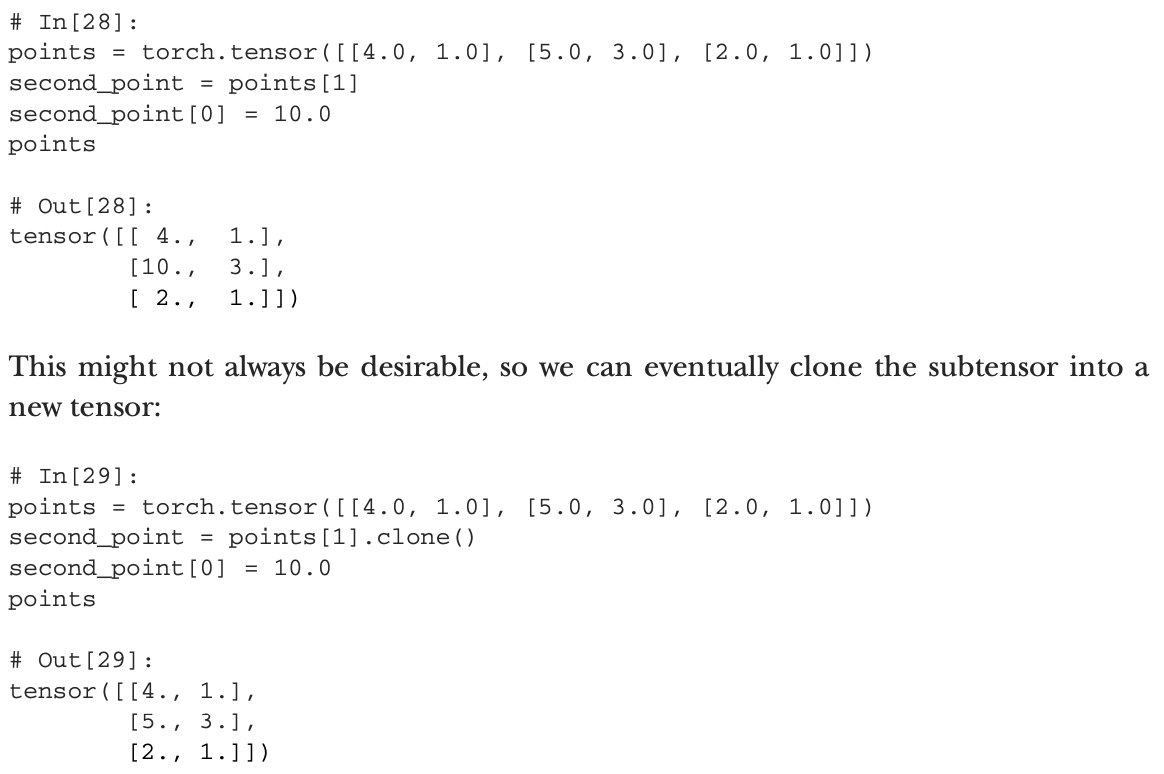 우측그림에서, 두 텐서(a,b)가 같은 storage를 보는 경우 a[0]=1 이런 식의 변경이 일어나면 storage에 변경이 일어나서 b도 변경된다. 아래그림과 같이 clone을 사용하여 문제를 해결할 수 있다.