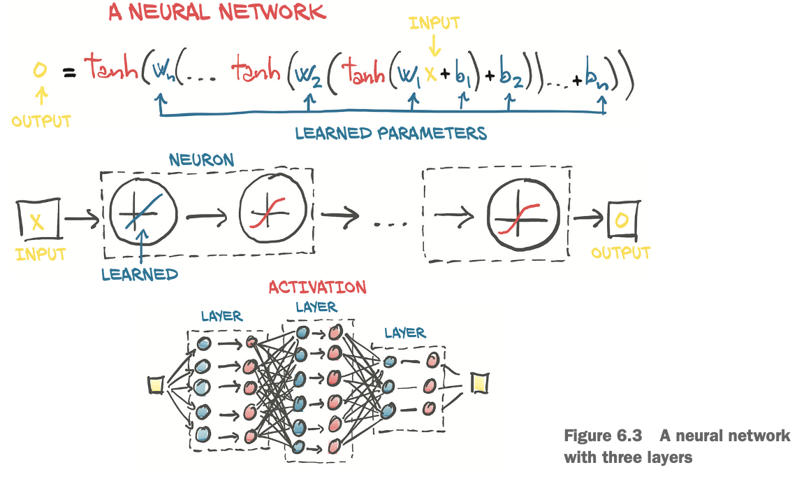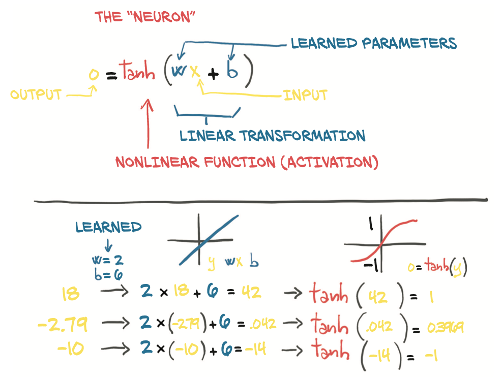 - neuron: neural network의 기초 블록(layer). input -> linear transformation -> activation -> output 형태.